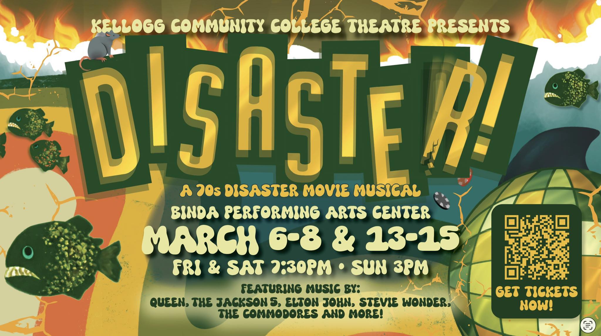 KCC Theatre’s Disaster! enters its final weekend of performances at the Binda Performing Arts Center at Kellogg Community College. The two-hour jukebox comedy will be performed tonight, Saturday, March 14, at 7:30 p.m. and will close Sunday, March 15, at 3:00 p.m.